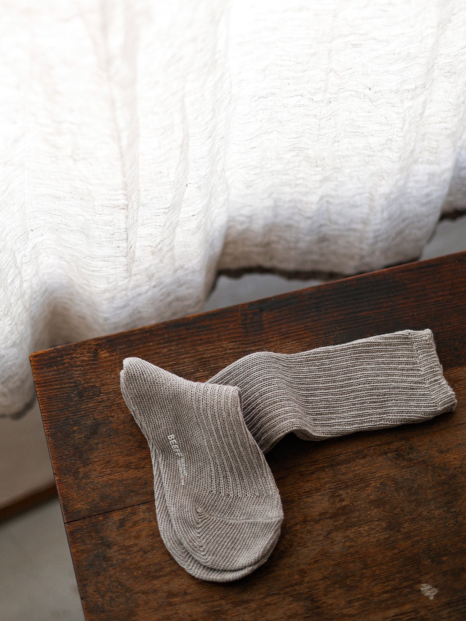 These socks are woven from a ramie and cotton blend, and Beeff specially customized a "quiet gray" dye. The inspiration came from a roll of undyed yak wool yarn we saw at an exhibition; its color transitioned from light gray to dark gray. We wanted to incorporate this natural texture into our socks, dyeing it with the ramie and cotton blend yarn. We hope you'll like the natural, rustic feel.